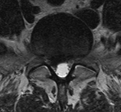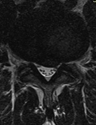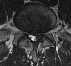 Axial T2 weighted image of the lumbar spine. The same L5-S1 disc extrusion, is displacing and compressing descending left S1 nerve root.